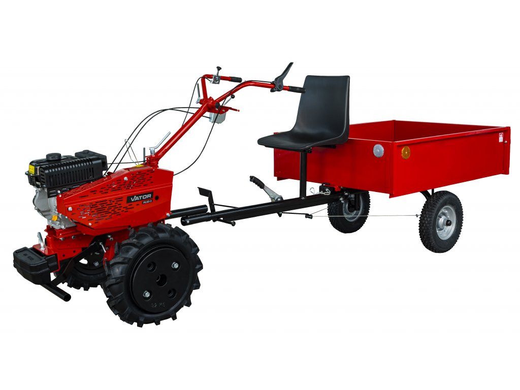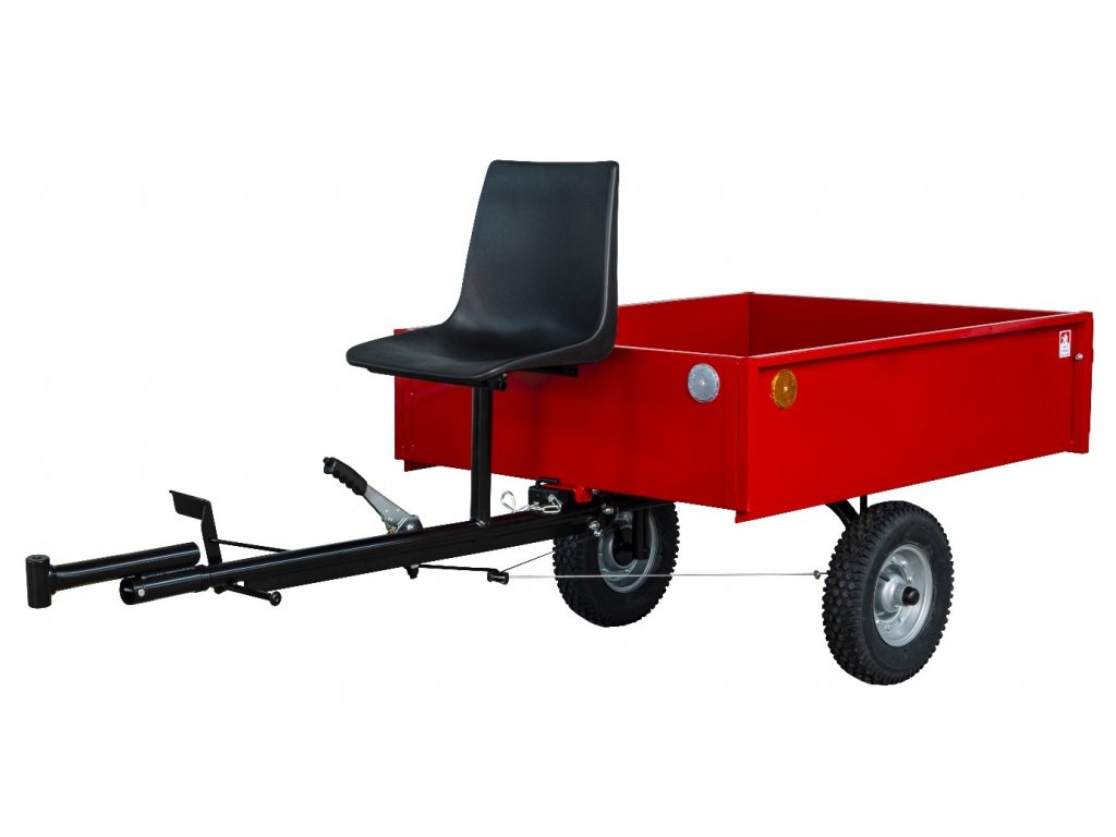 Przyczepa hamowana. Nośność 300kg, koła 4.00-8 z łożyskami tocznymi, skrzynia wywrotka o powierzchni ładunkowej 1270x955x300mm, kompatybilna z beczkowozem.