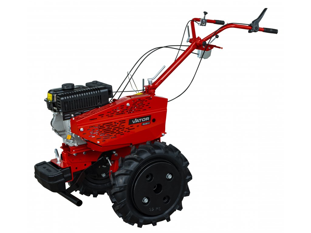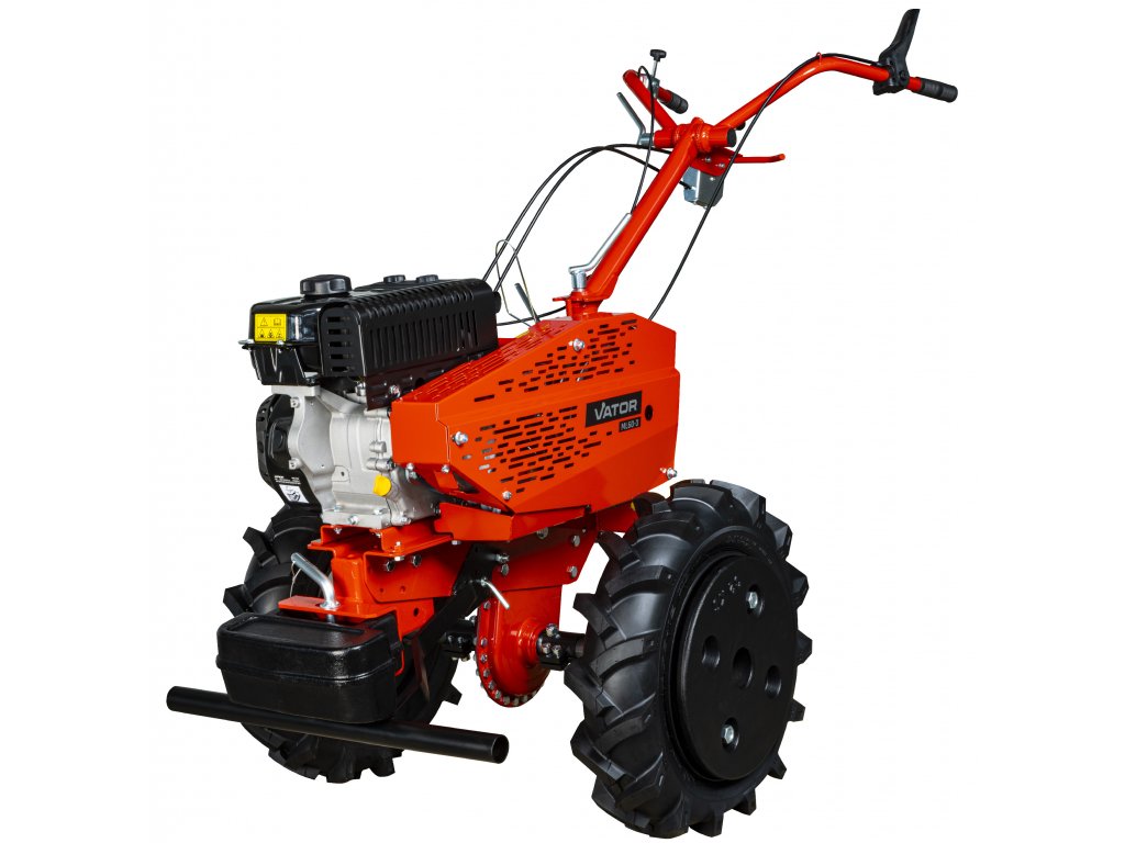 Na zdjęciu jest Zestaw podstawowy z obciążnikami (obciążniki nie są częścią zestawu podstawowego). Zestaw podstawowy VATOR można zmontować z zestawu części przeznaczonych do jazdy i JEDNOSTKI NAPĘDOWEJ VATOR ML60-3 (VAT-PJ-0101). Umożliwia ciągnięcie, pchanie i niesienie narzędzi pasywnych lub aktywnych. W celu uzyskania odpowiedniej trakcji na osiach kół poprzez mechanizmy wolnego biegu montowane są CIĘŻKIE KOŁA ŻELIWNE (2 x 22kg) z grubym bieżnikiem. Do przedniej części jednostki napędowej wkłada się przedni nośnik narzędzi oraz mocuje podporę serwisową. W rezultacie otrzymujemy ręcznie prowadzony mały ciągnik VATOR. Zmontowana w ten sposób maszyna stanowi efektywne rozwiązanie dla większości czynności związanych z uprawą gleby, zagospodarowaniem gruntu i terenów utwardzonych czy też pracami w lesie i sadzie. Nadaje się również do każdej innej pracy, w której można wykorzystać odpowiednią siłę trakcji i możliwości zapewnione przez możliwość zmiany biegów podczas jazdy
